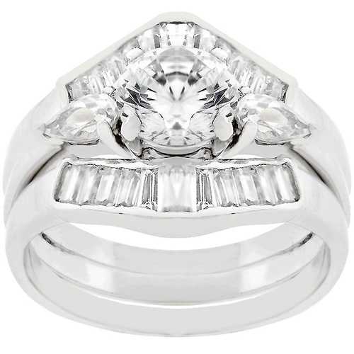 This ring set is centered by a round cut cubic zirconia and bordered by two pair shaped cubic zirconia. Channel set cubic zirconia accentuate this set. Genuine Rhodium Plating is achieved using an electroplating process that coats the item with heavy layers of rhodium a close cousin to platinum which...