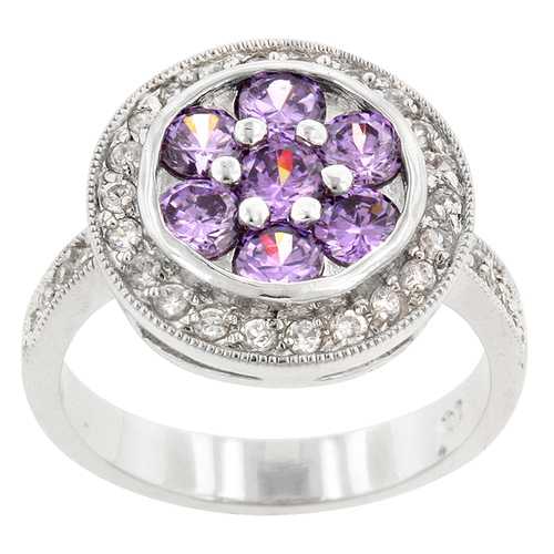 The Amethyst Purple Lily's delicate look displays seven amethyst cubic zirconia and an additional layer of clear accents. Genuine Rhodium Plating is achieved using an electroplating process that coats the item with heavy layers of rhodium a close cousin to platinum which gives our jewelry a platinum luster.Base Metal: Lead...