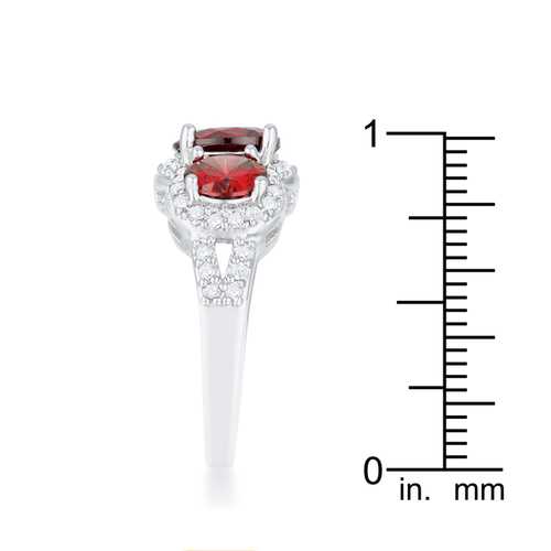 Clear finely cut stones accent a trio of elegant garnet stones in this classic 6.75 carat cocktail ring. Our genuine rhodium finish is achieved using an electroplating process that coats the item with heavy layers of rhodium a close cousin to platinum. This gives our jewelry a platinum luster.Base Metal:...