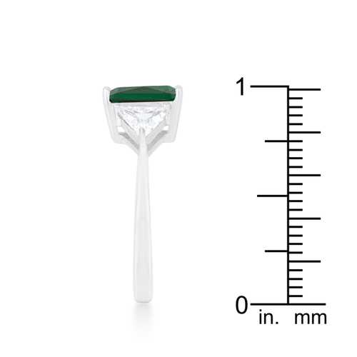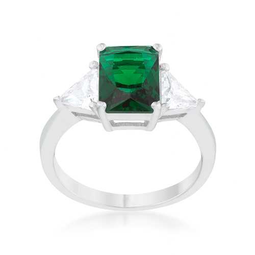 A pair of clear trillion cut stones accompany an emerald radiant cut center stone in this elegant 4.5ct CZ engagement ring. A modern twist on a classic piece. Our genuine rhodium finish is achieved using an electroplating process that coats the item with heavy layers of rhodium a close cousin...