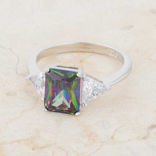 A pair of clear trillion cut stones accompany a sapphire emerald cut center stone in this elegant 4.5 carat engagement ring. A modern twist on a classic piece. Our genuine rhodium finish is achieved using an electroplating process that coats the item with heavy layers of rhodium a close cousin to platinum. This gives our jewelry a platinum luster.
