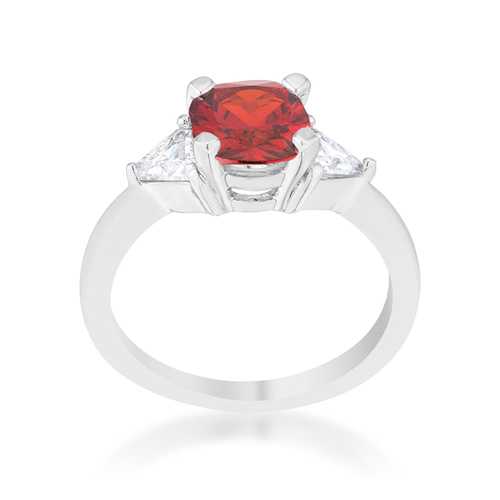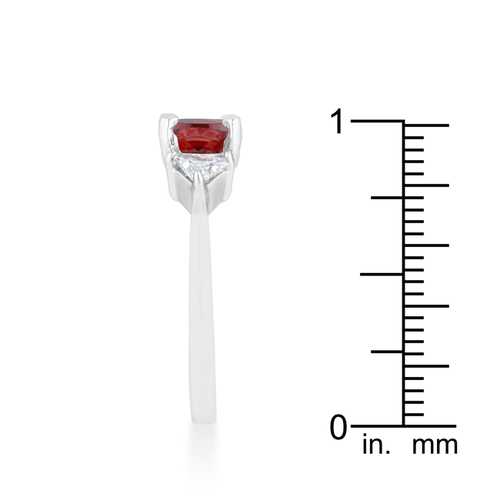 A pair of clear trillion cut stones accompany a ruby cushion cut center stone in this elegantly simple 1.8 carat engagement ring. A modern twist on a classic piece.Base Metal: Lead Free Alloy (brass)Style: , Setting Type: ProngMaterials: , Stone Cut: Cushion|TrillionColor: , Plating Color: RhodiumRing Band Width: 2.2mmStone Size:...