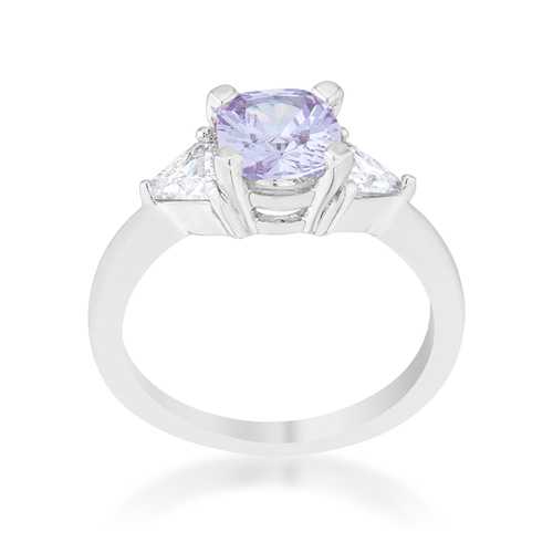 A pair of clear trillion cut stones accompany a lavender cushion cut center stone in this elegantly simple 1.8 carat engagement ring. A modern twist on a classic piece.Base Metal: Lead Free Alloy (brass)Style: , Setting Type: ProngMaterials: , Stone Cut: Cushion|TrillionColor: , Plating Color: RhodiumRing Band Width: 2.2mmStone Size:...