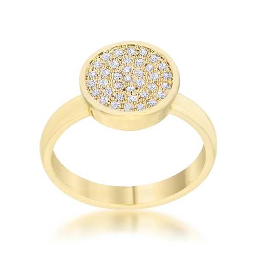Small clear stones accent a contemporary circle style for a cool modern look. A classically simple statement piece.Base Metal: Lead Free Alloy (brass)Style: , Setting Type: PaveMaterials: , Stone Cut: RoundPlating Color: GoldtoneRing Band Width: 3mmStone Size: 1 Mm