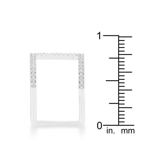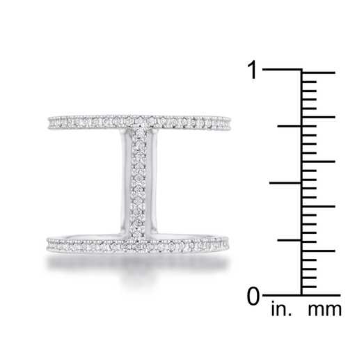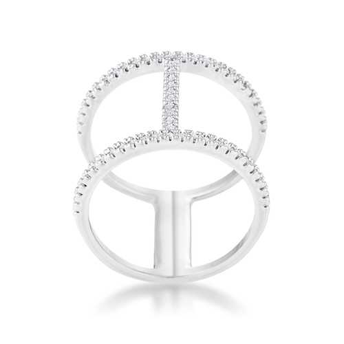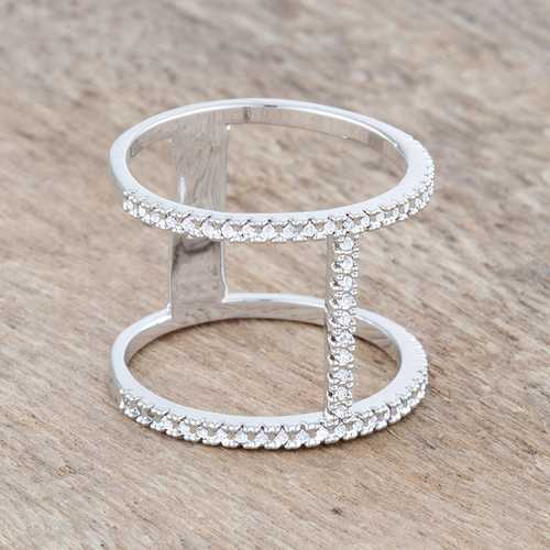 An open ring design is accented with clear stones in a contemporary design giving off the look of a double band design.Base Metal: Lead Free Alloy (brass)Style: , Setting Type: PaveMaterials: , Stone Cut: RoundPlating Color: RhodiumRing Band Width: 5 MmStone Size: 15 Mm