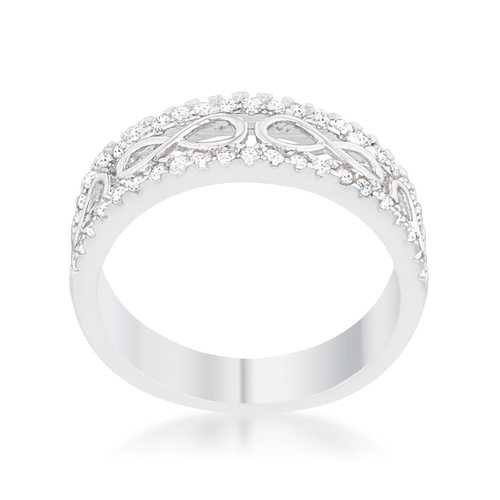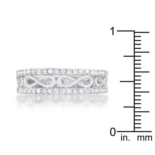 Small clear stones accent a classic band ring topped off with infinity designs.Base Metal: Lead Free Alloy (brass)Style: , Setting Type: PaveMaterials: , Stone Cut: RoundPlating Color: RhodiumRing Band Width: 4mmStone Size: 1.25 Mm