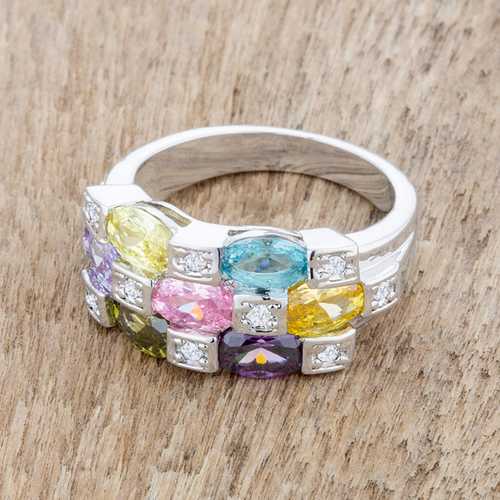 A mix of multicolor stones in varying stone cuts accent a classic stacked design of this elegant statement piece.Base Metal: Lead Free Alloy (brass)Style: , Setting Type: BezelMaterials: , Stone Cut: RoundPlating Color: RhodiumRing Band Width: 3mmStone Size: 1.25mm