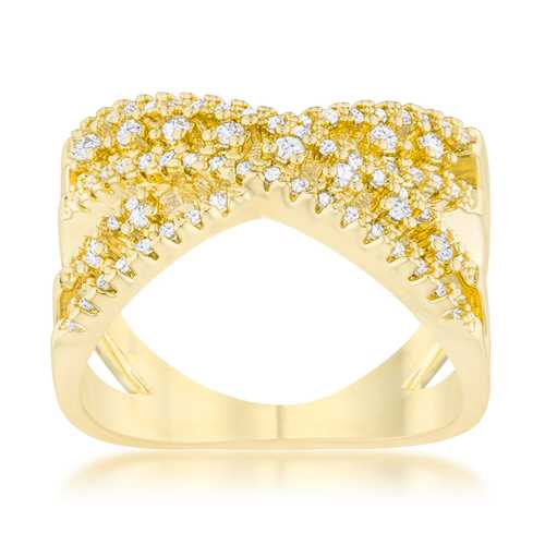 Clear stones accent a criss-cross design in an elegant wide cocktail ring.Base Metal: Lead Free Alloy (brass)Style: , Setting Type: PaveMaterials: , Stone Cut: RoundPlating Color: GoldtoneRing Band Width: 2.5mmStone Size: 1 Mm