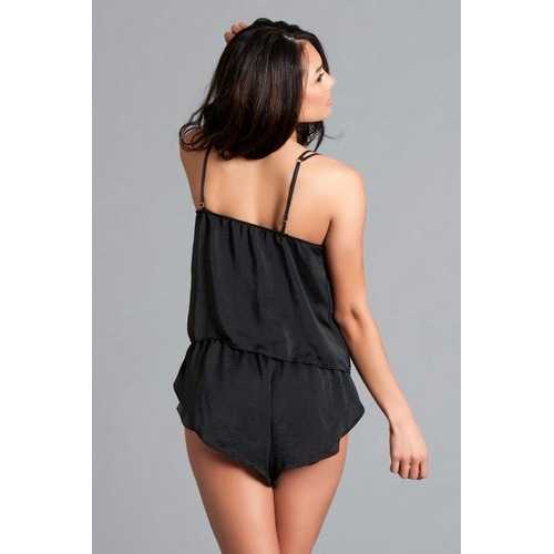 Cami and short set loose lightweight material high cut sided shorts double strap cami top deep V-neckline with guipure lace edging and corset frontBox packaging Packaging dimensions (in): 10x7x1Size: SColor: Black