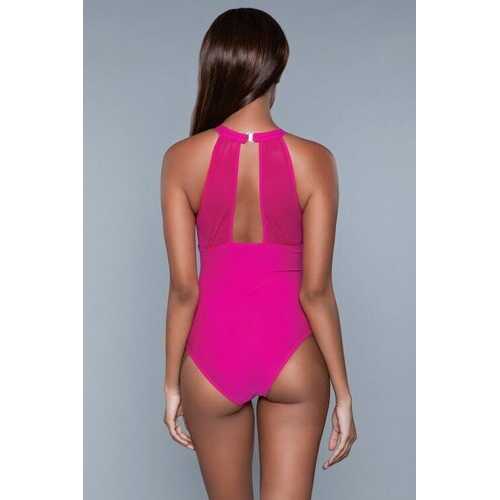 1 Piece High neck design swimsuit with mesh detail deep plunge back and ruched pattern midsectionHand wash cold separately/ Do not twist or wring/ Line dry 82% Polyester 18% ElastanePolybag packagingSize: SColor: Fuchsia