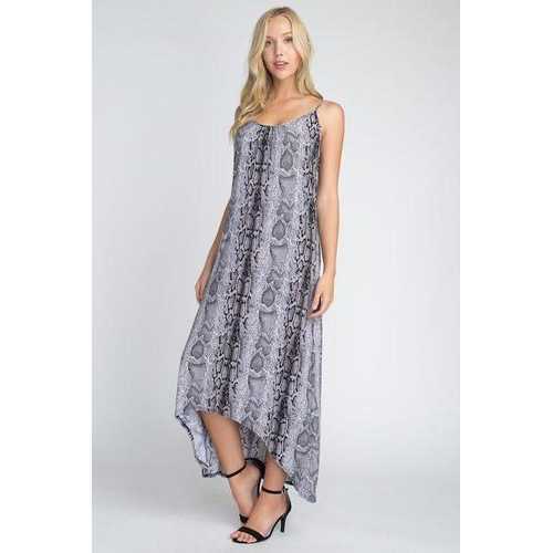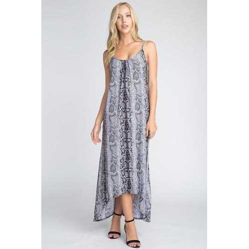 This maxi tank dress features a snakeskin print and is very flowy Model is wearing a size Small Hand Wash Cold Imported Style #: MMD4169